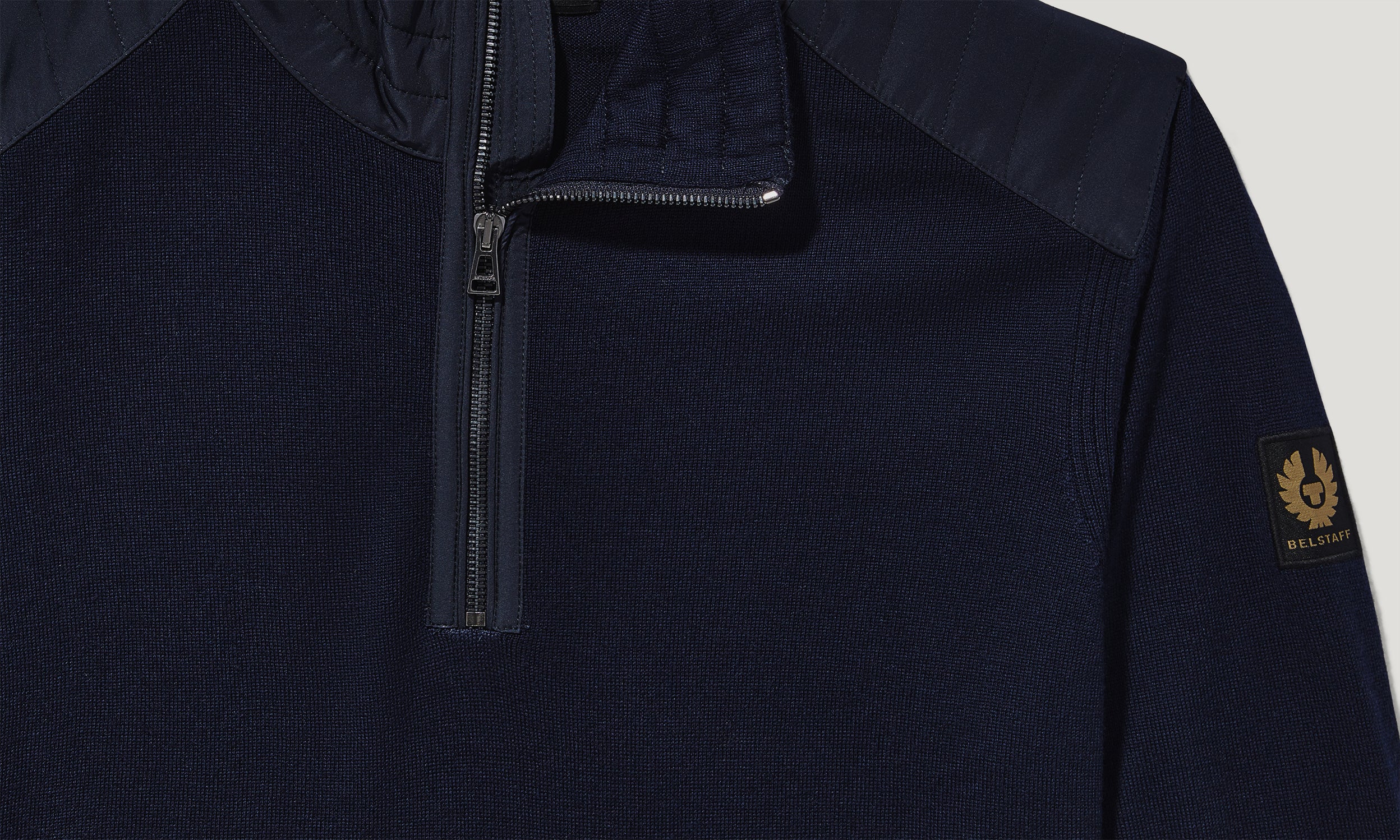 Soft extra fine merino wool with textural nylon quilting detail at collar and shoulder